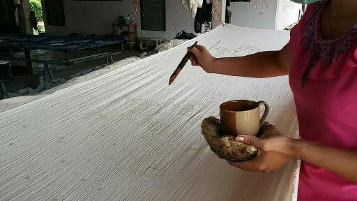 溶かした蝋を筆で生地に塗り、その部分が染まらなくなることで模様を描く技法です。中国の伝統的な染物工芸で、絞り染め、型染めと並び、中国古代の三大模様染め技術とされます。蝋を薄く塗ると、少しだけ染まったりして、独特の色合いを引き出します。えむえむはタイ・チェンマイの染色工房で一つ一つを染め上げており、オンリーワンの作品を作り続けています。